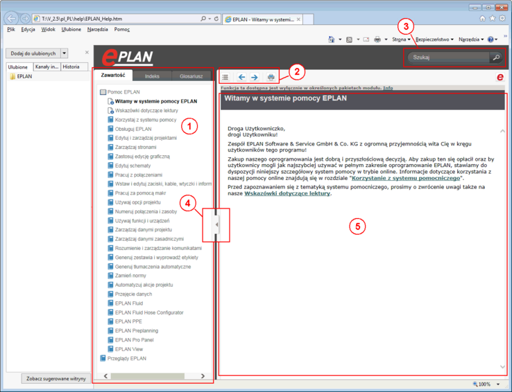 System pomocy EPLAN został przekształcony w aktualnej wersji. System pomocy HTML (*.chm), wykorzystywany we wcześniejszych wersjach programu, został wymieniony na nowy format HTML5. Ten format ma wiele ważnych zalet w odniesieniu do starego formatu pomocy: