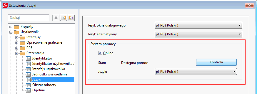Nowe elementy interfejsu Niektóre funkcje, takie jak przewijanie do przodu i wstecz oraz lista ulubionych zostały przejęte przez standardowe funkcje przeglądarki internetowej. Inne elementy interfejsu, takie jak pasek narzędzi systemu pomocy zostały przekształcone. Poniżej przedstawiono te zmienione i nowe elementy. Wyszukiwanie tekstowe Wyszukiwanie tekstowe znajduje się przy prawej górnej krawędzi okna pomocy powyżej paska narzędzi. Przeszukiwane są wszystkie strony systemu pomocy według wprowadzanych szukanych pojęć. Wynik szukania tekstowego jest taki, jak ten znany z wyszukiwarek internetowych: jako wynik zostanie utworzona lista znalezionych pojęć, których wpisy można odtworzyć kliknięciem. Jako informacja uzupełniająca w tytule znalezionego wyrażenia wyświetla się krótki fragment tekstu. Dzięki temu można już wcześniej rozpoznać, które znalezione wyrażenia odpowiadają Twoim oczekiwaniom. Nowy format systemu pomocy umożliwia rozszerzone wyszukiwanie przy użyciu synonimów. Także w przypadku wpisania podobnego, nieużywanego lub błędnego pojęcia, w wielu przypadkach wyświetli się prawidłowy wynik wyszukiwania. Otwieranie systemu pomocy przy użyciu połączenia internetowego Nowy system pomocy jest teraz udostępniony dodatkowo na serwerze EPLAN. Dzięki temu istnieje możliwość wywołania systemu pomocy EPLAN przy użyciu połączenia internetowego. Jeżeli nie jest to pożądane (np. z powodu braku dostępu do internetu), system pomocy nadal można zainstalować na lokalnym nośniku danych. Odpowiednich ustawień można dokonać w nowym oknie dialogowym ustawień Ustawienia: języki za pomocą nowego pola grupy System pomocy (ścieżka menu: Opcje > Ustawienia > Użytkownik > Prezentacja > Języki.). Jeżeli system pomocy ma być uruchomiony przy użyciu połączenia internetowego, aktywuj pole wyboru Online. W ramach tego rozszerzenia ustawienia Język okna dialogowego, Język alternatywny oraz Język systemu pomocy (teraz Język), które znajdowały się do tej pory w oknie dialogowym Ustawienia: interfejs użytkownika, zostają przesunięte do nowego okna dialogowego ustawień.